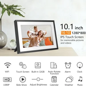 Share your favorite memories instantly with this 10.1-inch WiFi Digital Photo Frame. Featuring a vivid 1280×800 HD IPS touchscreen and built-in 32GB storage, you can easily send photos and videos via app or email from anywhere.